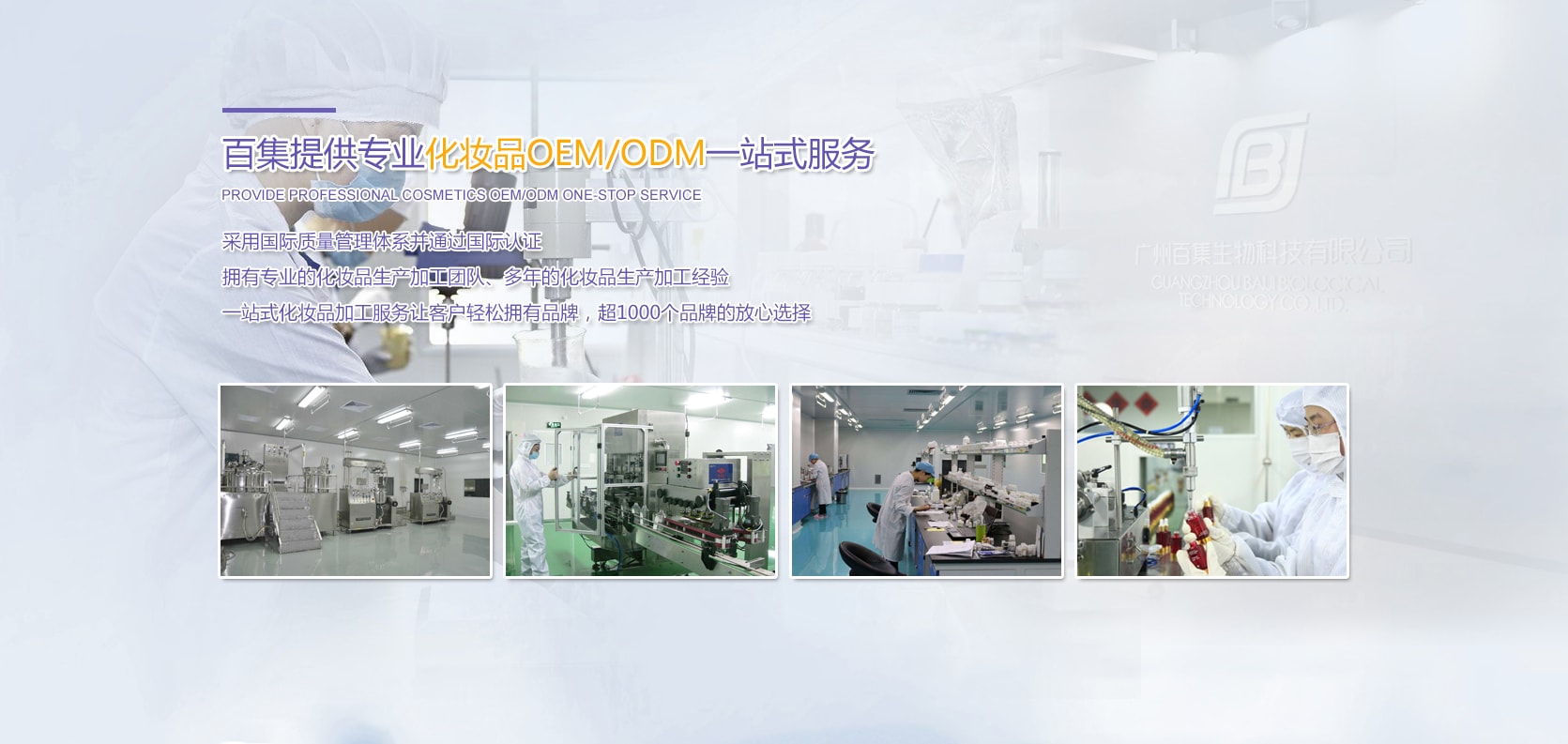 百集生物擁有16位專業(yè)工程師,79多位研發(fā)人員,6000多款成熟配方 百集生物研發(fā)中心占地3000多平方米,擁有成熟的研發(fā)團(tuán)隊及完善的研發(fā)設(shè)施,使用納米技術(shù)、滲透壓技術(shù)、 液晶微乳化技術(shù)等,已經(jīng)擁有一系列穩(wěn)定性高、滲透性強(qiáng)、吸收性好、效果顯著的成熟配方。